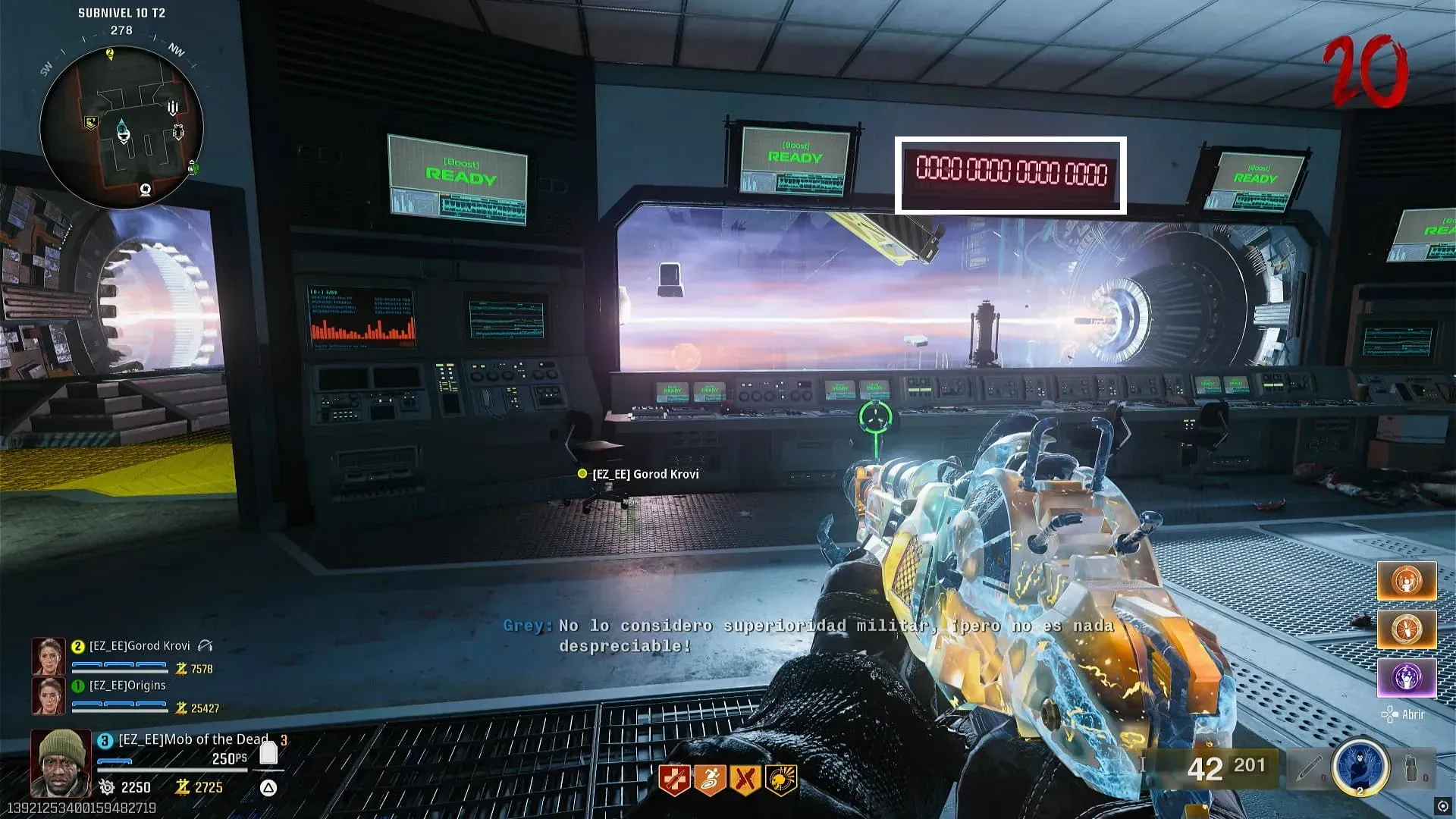 - En la terminal donde comienzas la contención donde debes matar a las Alimañas Cuánticas, veras una pantalla con dígitos que mientras completas este paso, irá subiendo. Si el jugador consigue más de 2000 puntos, un Power Up de Ventaja Aleatoria aparecerá frente a esta terminal.