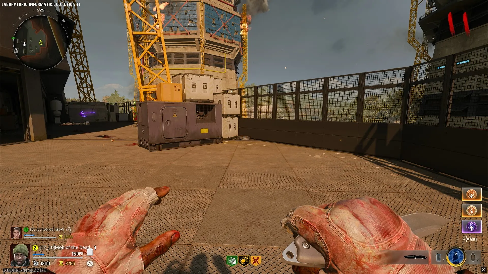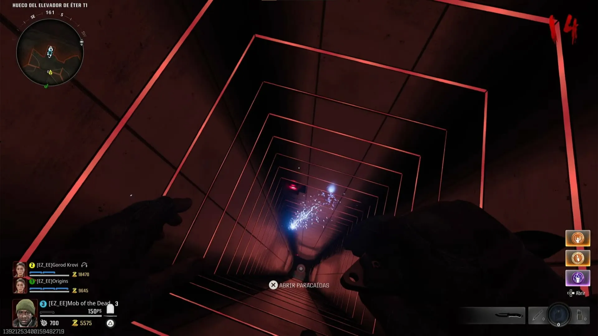 Debes tirarte y sacar el paracaídas, luego debes interactuar con cada uno de estos botones para irlos prendiendo. Si lo haces correctamente, serás llevado a Núcleo de Informatica Cuántica T1 nuevamente