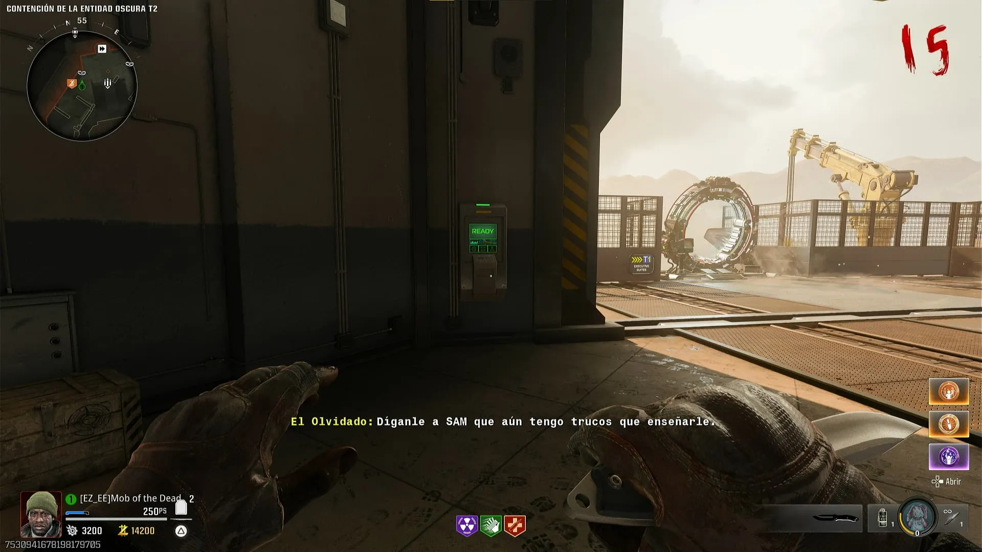 - Interactúa con el contenedor para colocar el disco duro, luego debes esperar unos segundos hasta que este termine. Los zombies trataran de atacar el contenedor así que debes protegerlo o simplemente dejar un zombie y ponerte frente a el (por alguna razón te ignora completamente)