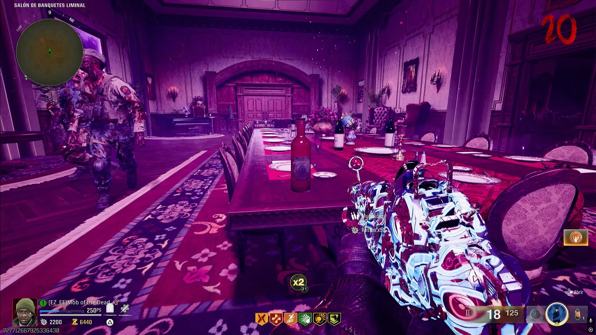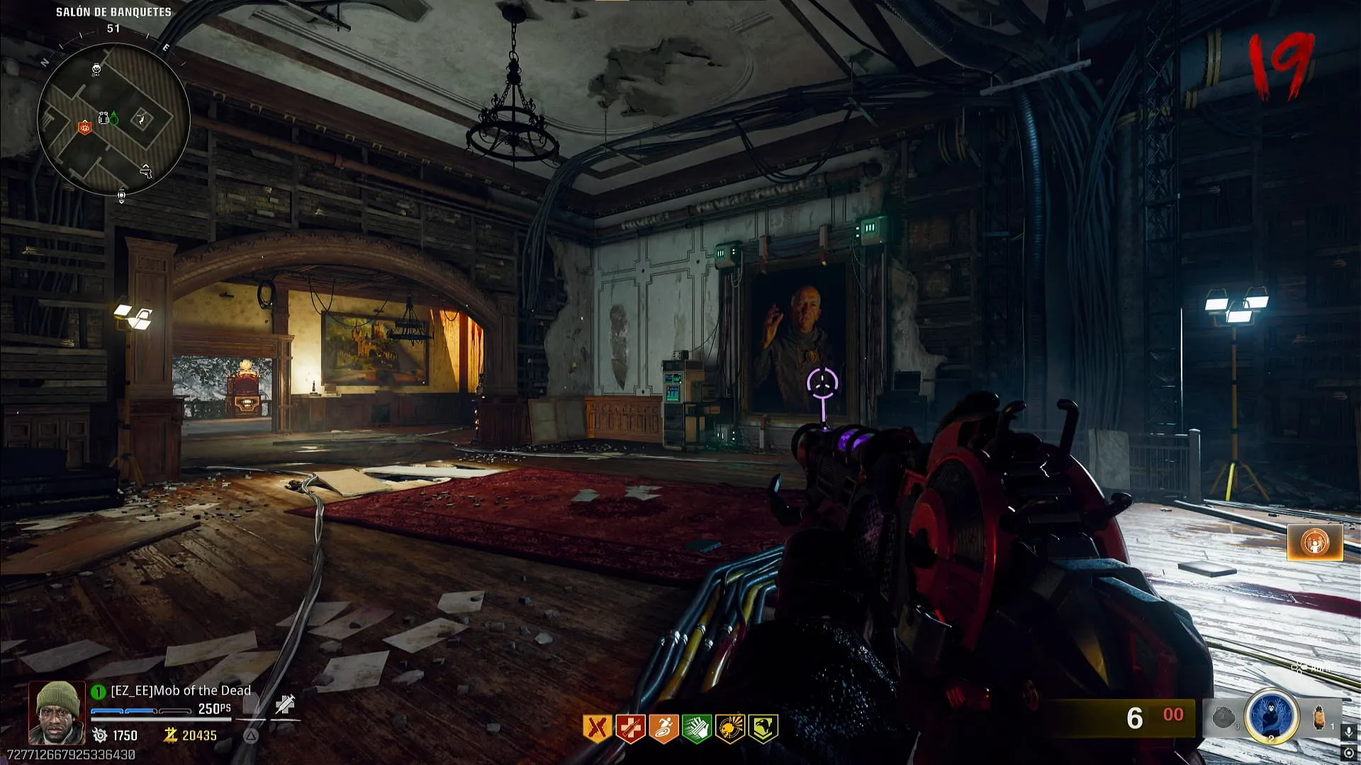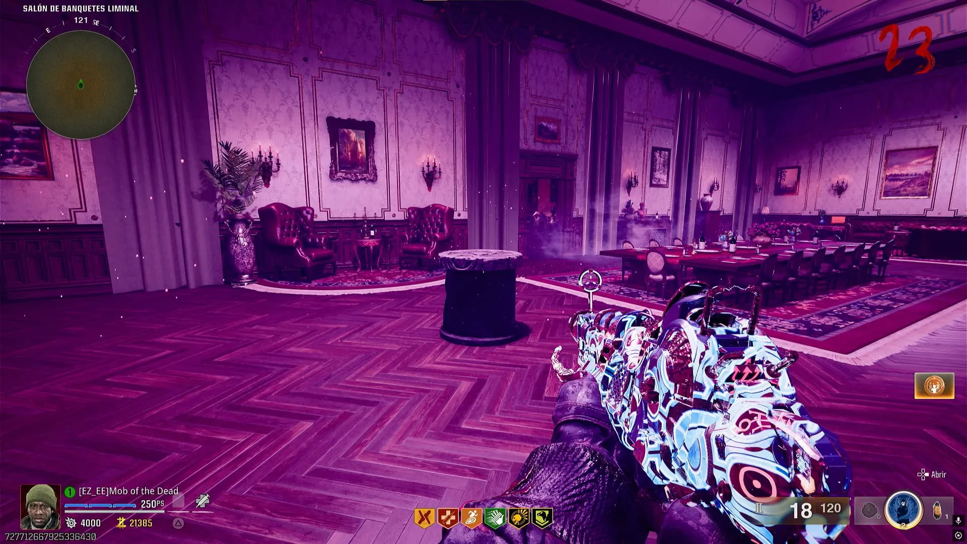 - Ritual de Ray Gun Mark II-P (la morada escopeta). Dirígete a Salón de Banquetes e interactúa con una computadora dentro de esta zona, luego tienes que matar zombies utilizando la Ray Gun Mark II-P para llenarla. Al hacerlo se abrirá un portal en el cuadro.
