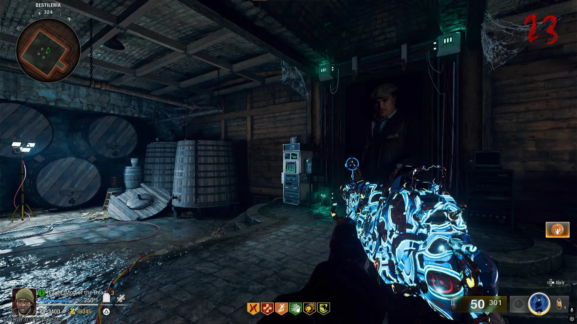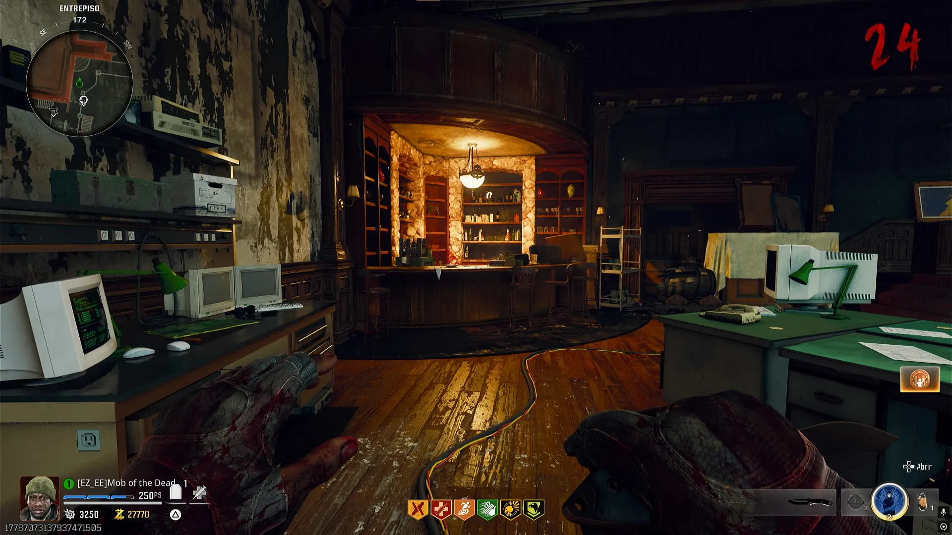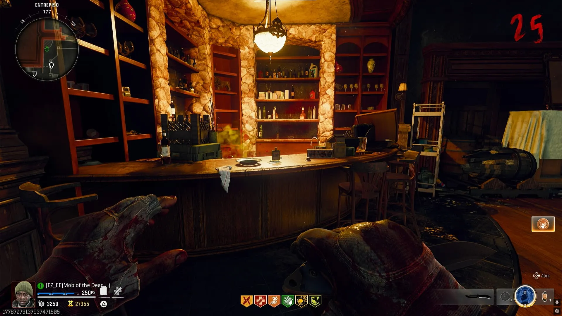 - Colócale el modificador de Descomposición Cerebral a una de tus armas y convierte a un zombie cerca del bar. Interactúa con la campana y el zombie se saltará el mostrador y te dará una bebida, recógela.