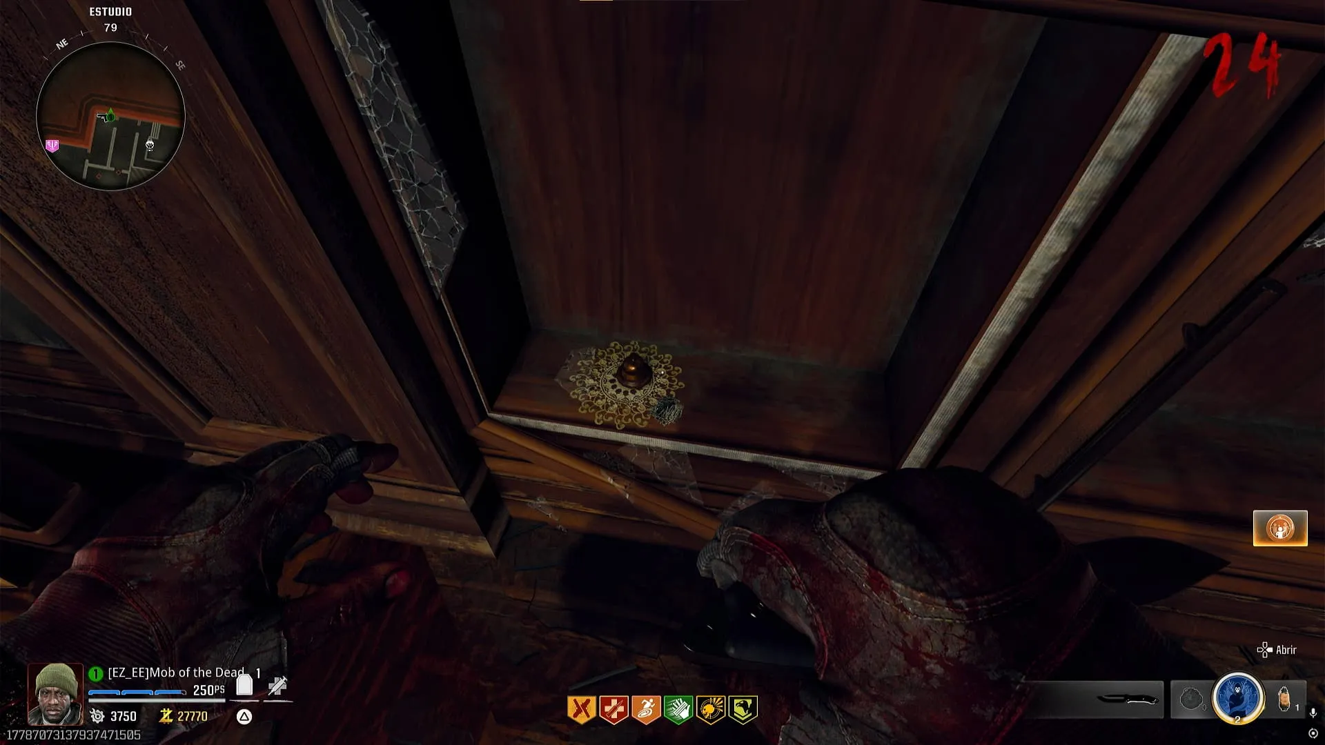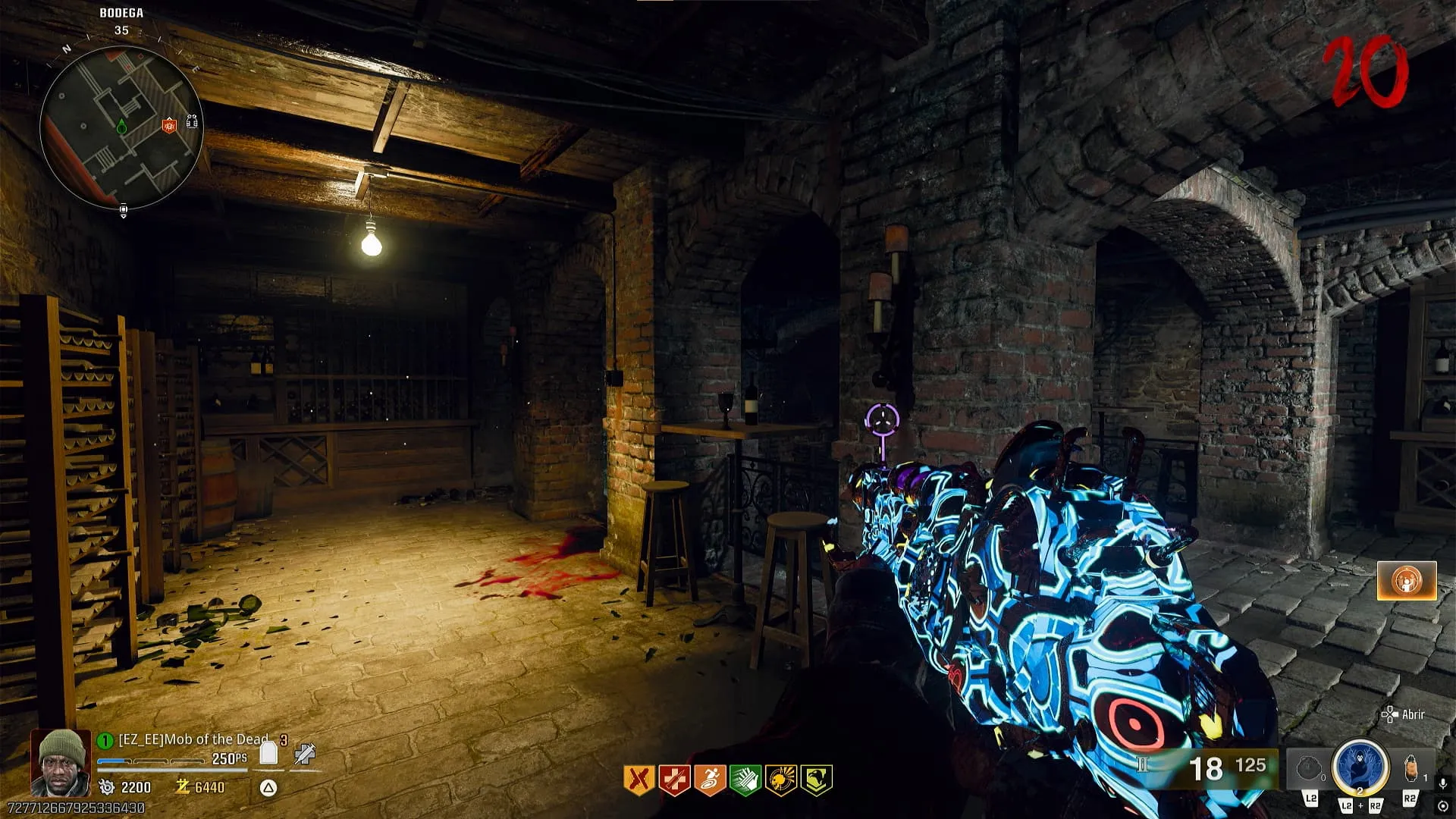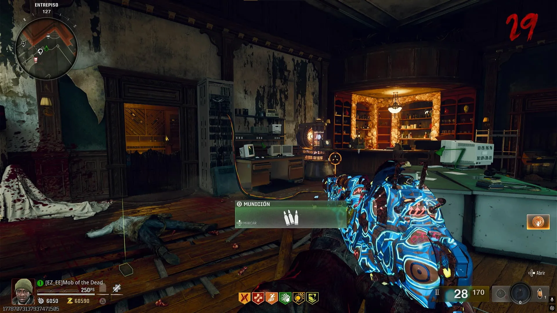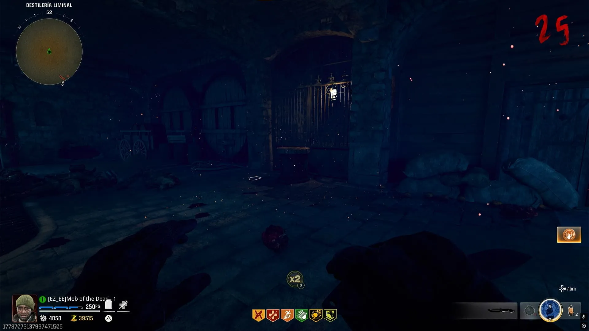 - Colócale el modificador de Descomposición Cerebral a una de tus armas y convierte a un zombie cerca del bar. Interactúa con la campana y el zombie se saltará el mostrador y te dará una bebida, recógela.