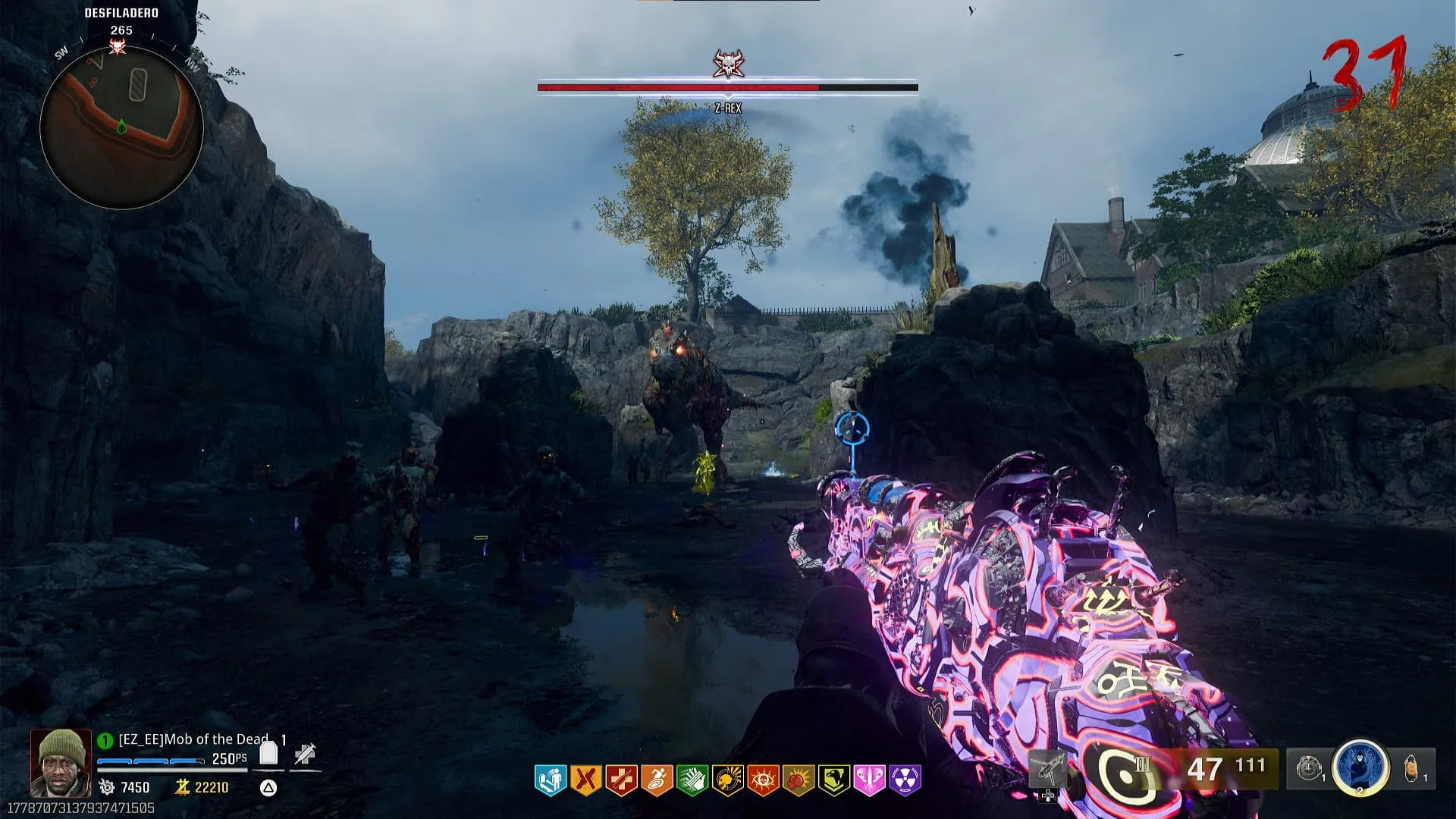 - Boss Fight. Esta pelea tiene cuatro fases que vas progresando mientras más daño le hagas. Haciendo que el Z-Rex haga más daño y salte encima de ti o te ataque con su cola, volviéndose más agresivo en general. Todo esto mientras te persiguen zombies que intentaran acorralarte. Al matarlo completaras el Quest Principal de Shattered Veil