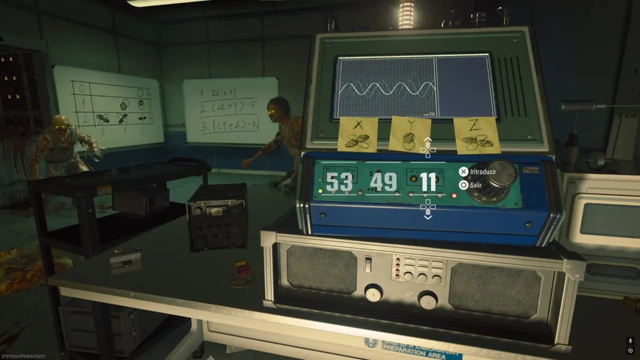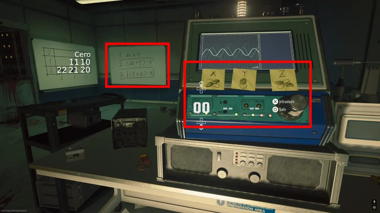 Verás que en esta sala hay dos pizarras. La pizarra de la izquierda contiene los números que representan cada símbolo que aparece en la computadora. La pizarra de la derecha representa la ecuación que debes hacer para sacar el valor de cada código.