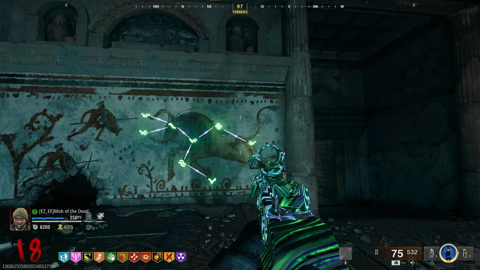 Si le disparas rápidamente a los símbolos I, I y V que aparecen en ambos murales del Bastón de hielo se activará la cancion Aether (The Tomb Mix)