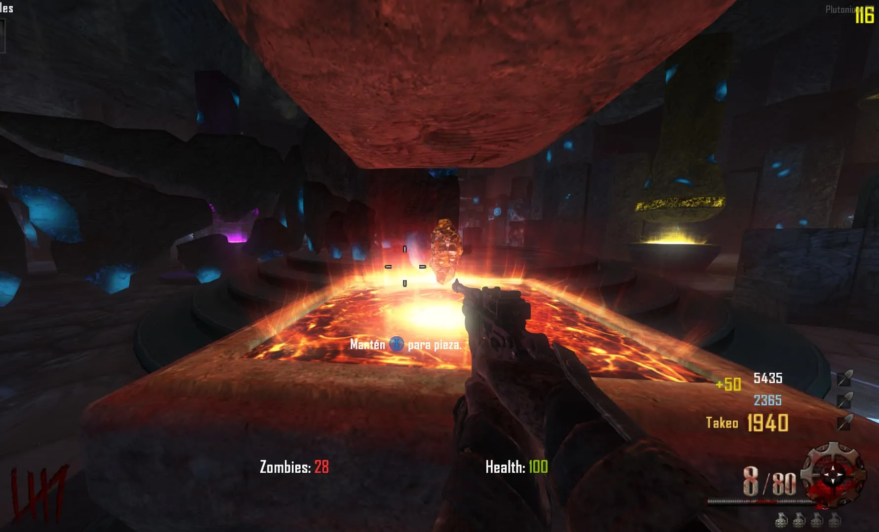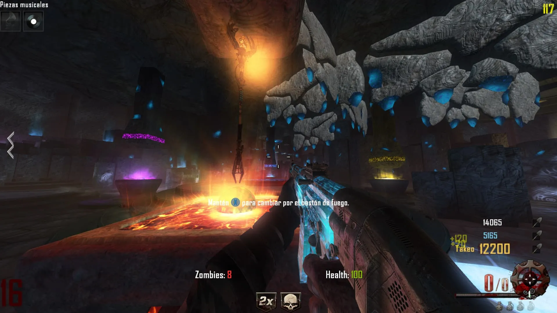 1. Ve al «Crazy Place», coloca el baston de fuego en un pedestal y mata 20 Zombies en esa zona. Luego tendrás el baston mejorado y lo podrás agarrar.