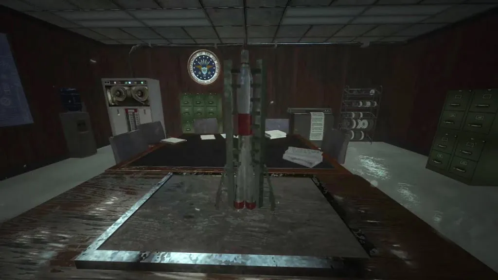 Al teletransportarte a la sala de conferencia/pentágono, interactúa con el cohete en la mesa, se elevará hasta atravesar el mapa.