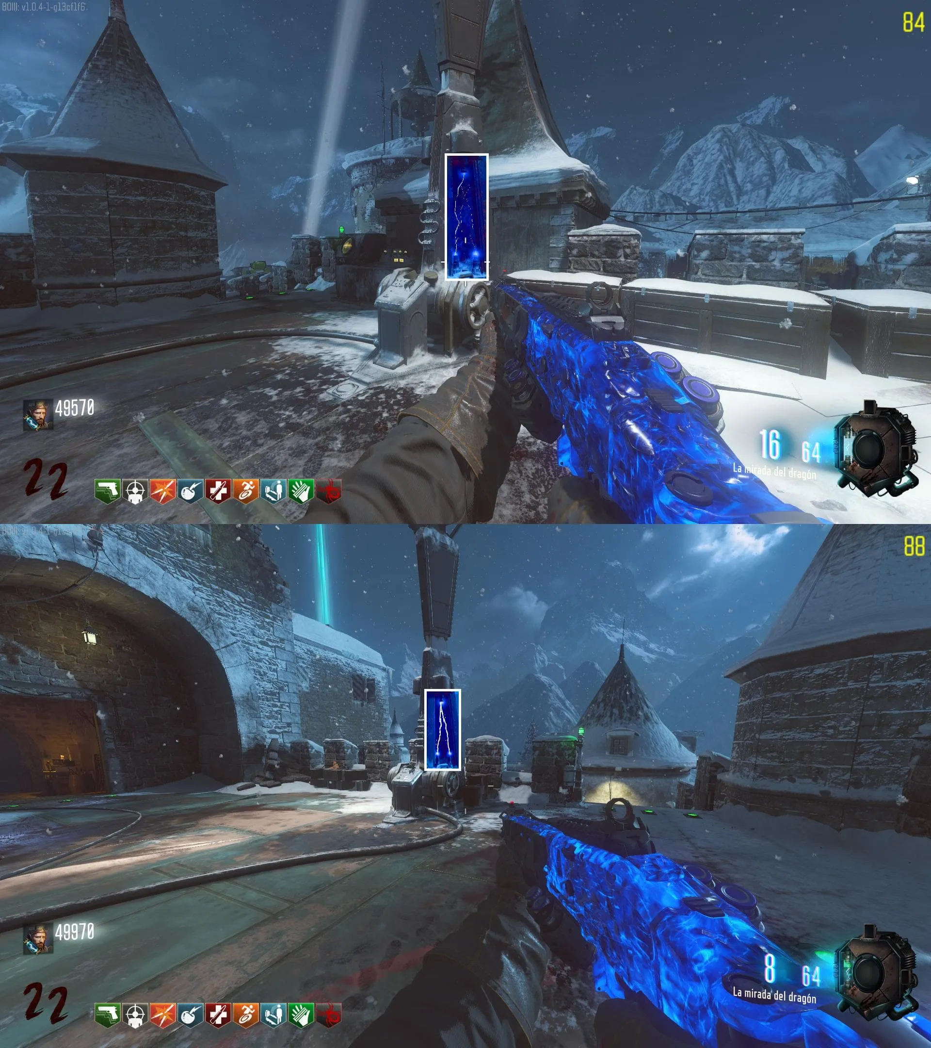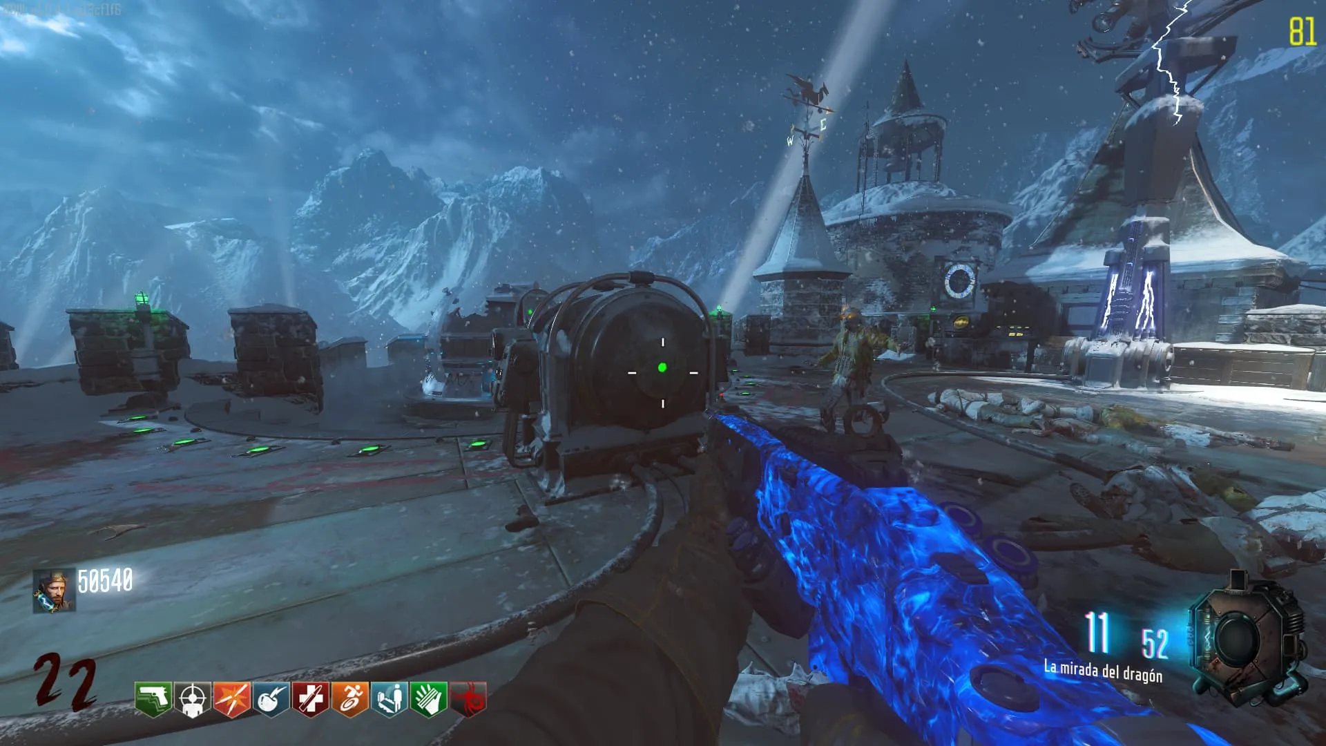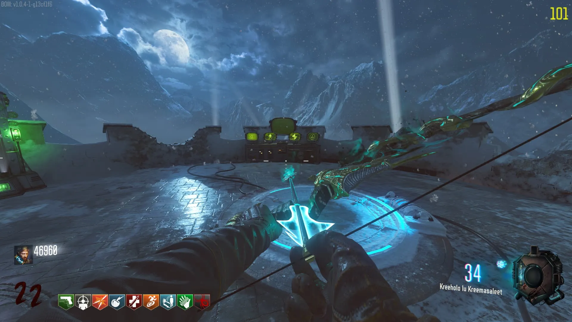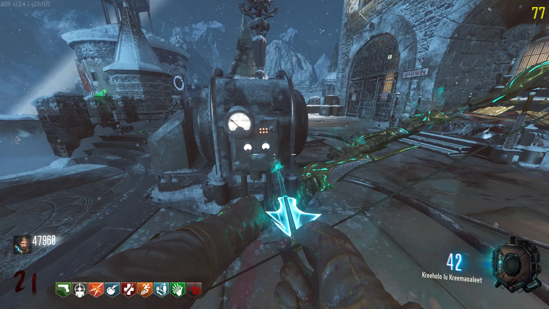 - El Keeper tendrá varias paradas alrededor del mapa, cuando se pare, dejará una zona marcada frente a él. Debes pararte en esa zona y empezar a matar Zombies con uno de los Arcos Mejorados. Al entrar a la zona tendrás un aura en tu pantalla, esa aura te dice que Arco debes usar.