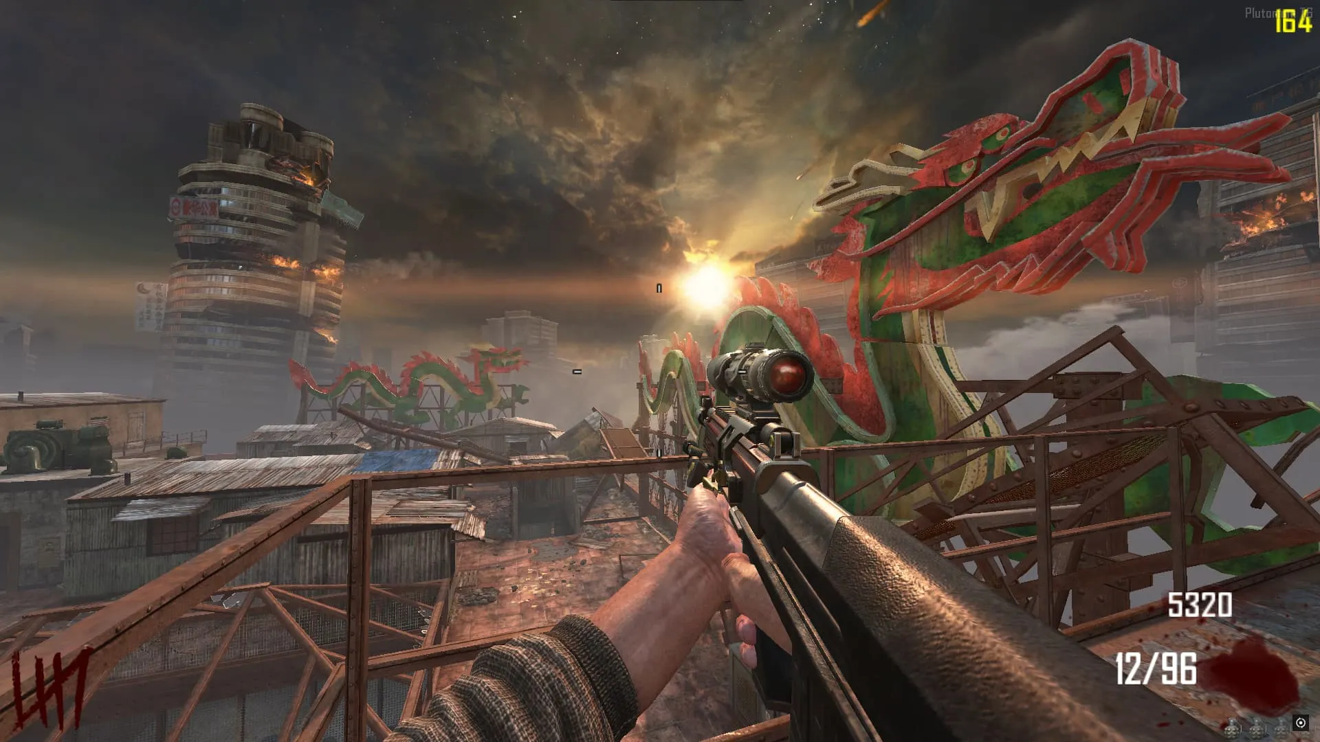 Compra un Sniper y dirígete al techo mirando a los 2 dragones, apunta con el Sniper veras dos esferas localizadas en la boca de cada dragon. Dispárale a ambas. Al completarse ambos dragones dispararan fuegos artificiales, uno azul de Richtofen, y otro naranja de Maxis.