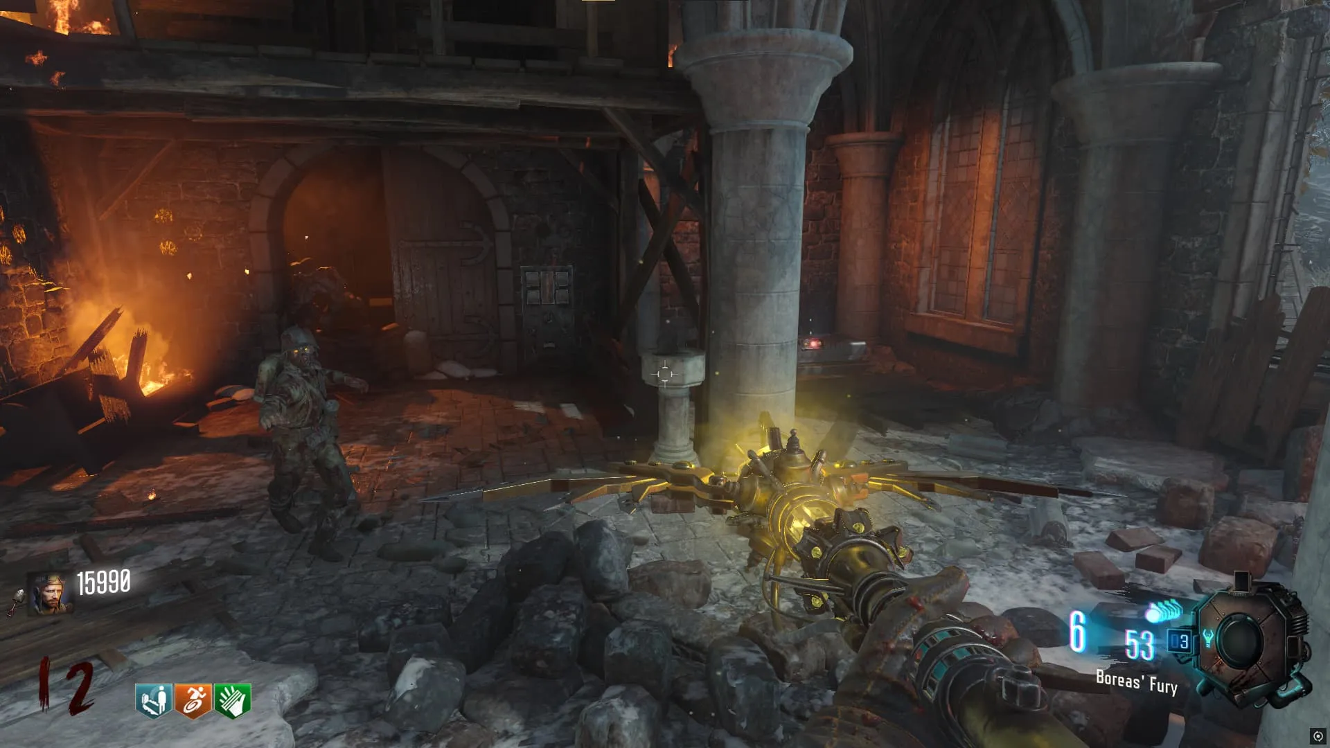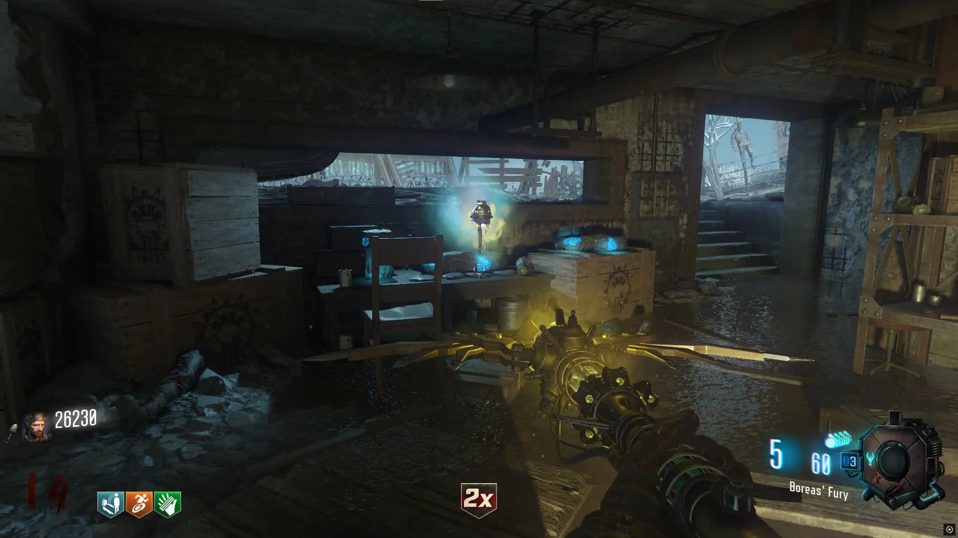 1. Recoge una de las tablas en una mesa del generador 2, dentro del bunker y llévalo a un pedestal con agua en la Iglesia. Debes matar 20 Zombies con ataques cuerpo a cuerpo (Escudo y Baston mejorado cuentan).