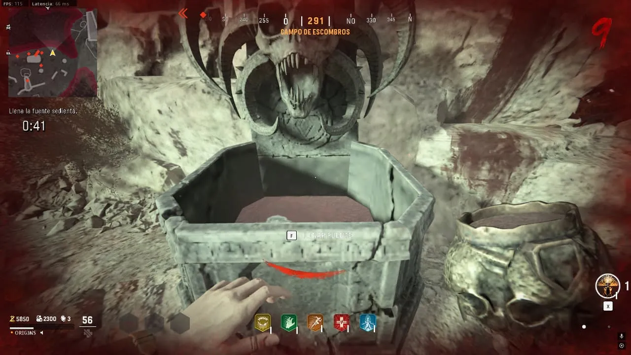 En este desafío, tendrás tiempo límite para utilizar el ataque especial del escudo en tres pilares de zombies (podrían ser más, dependiendo de los jugadores), luego interactuar con estos pilares y llevar la copa llena hasta la fuente vacía, llenándola.