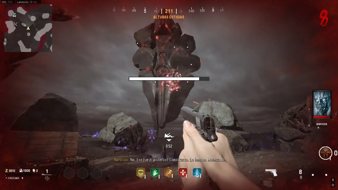 - Al activar Pack-A-Punch, si interactúas con el pedestal frente a él se activará una serie de diálogos que terminarán con un portal. Entra en él.